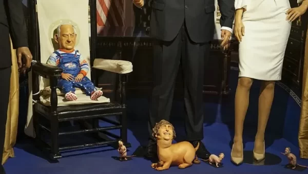 Provocación artística: Milei aparece como perro a los pies de Trump en una instalación del Museo de Cera