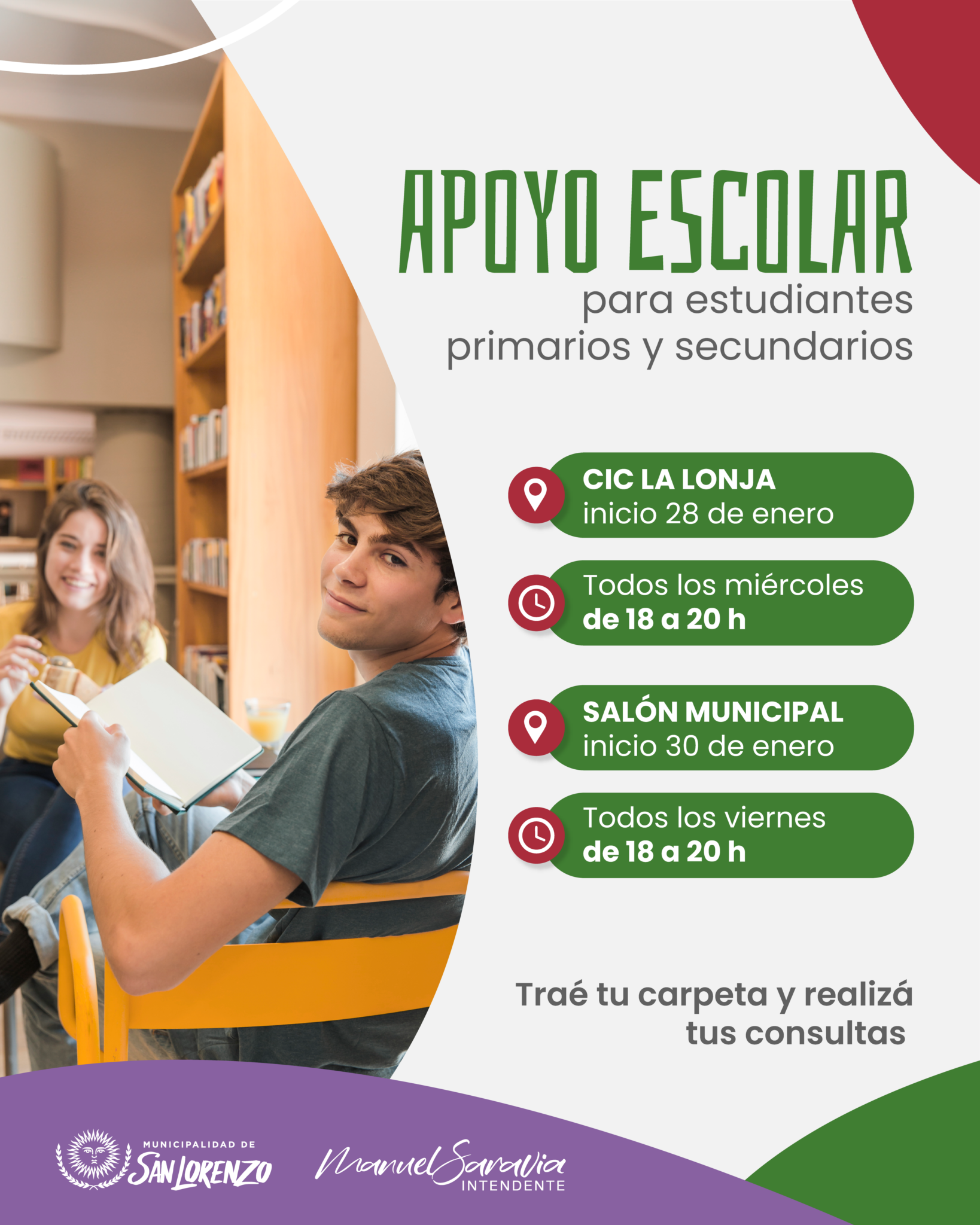 La Municipalidad de San Lorenzo invita a la comunidad estudiantil a participar de las clases de apoyo escolar, que comenzarán este miércoles 28 de enero en el CIC de La Lonja, en el horario de 18 a 20 horas, y continuarán el viernes 30 de enero en el Salón Municipal, también de 18 a 20 horas.