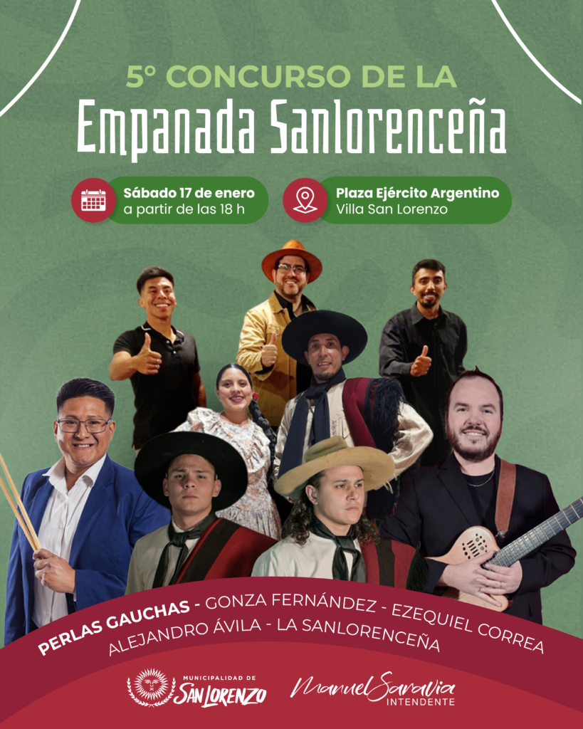 El Concurso de la Empanada se realizará el próximo 17 de enero a partir de las 18 horas en la Plaza Ejército Argentino, donde los presentes podrán disfrutar de fondas gastronómicas y un show folclórico con la participación de Perlas Gauchas, Gonza Fernández, Rodrigo Correa, Alejandro Avila y el Ballet La Sanlorenceña. Además, los más pequeños podrán divertirse con la visita de los Reyes Magos, peloteros y distintos juegos recreativos.