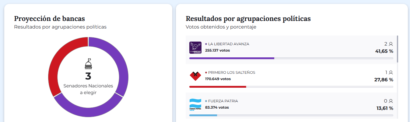 Con el 41,65% de los votos y 255.137 sufragios, La Libertad Avanza se impuso en las elecciones legislativas nacionales en la provincia de Salta, garantizándose dos de las tres bancas en disputa para el Senado.