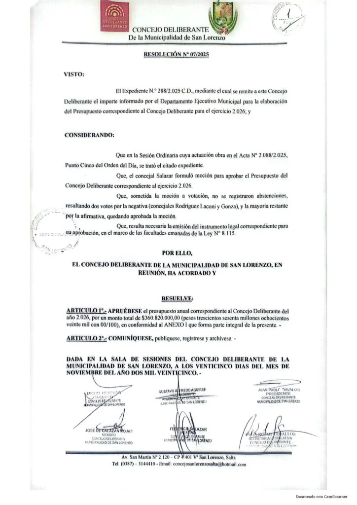 Durante una sesión ordinaria, los concejales aprobaron el Presupuesto del Concejo Deliberante de San Lorenzo para el año 2026, es decir, los fondos destinados exclusivamente al funcionamiento del cuerpo legislativo. El monto aprobado asciende a $360.820.000 y quedó formalizado mediante la Resolución N.° 07/2025.