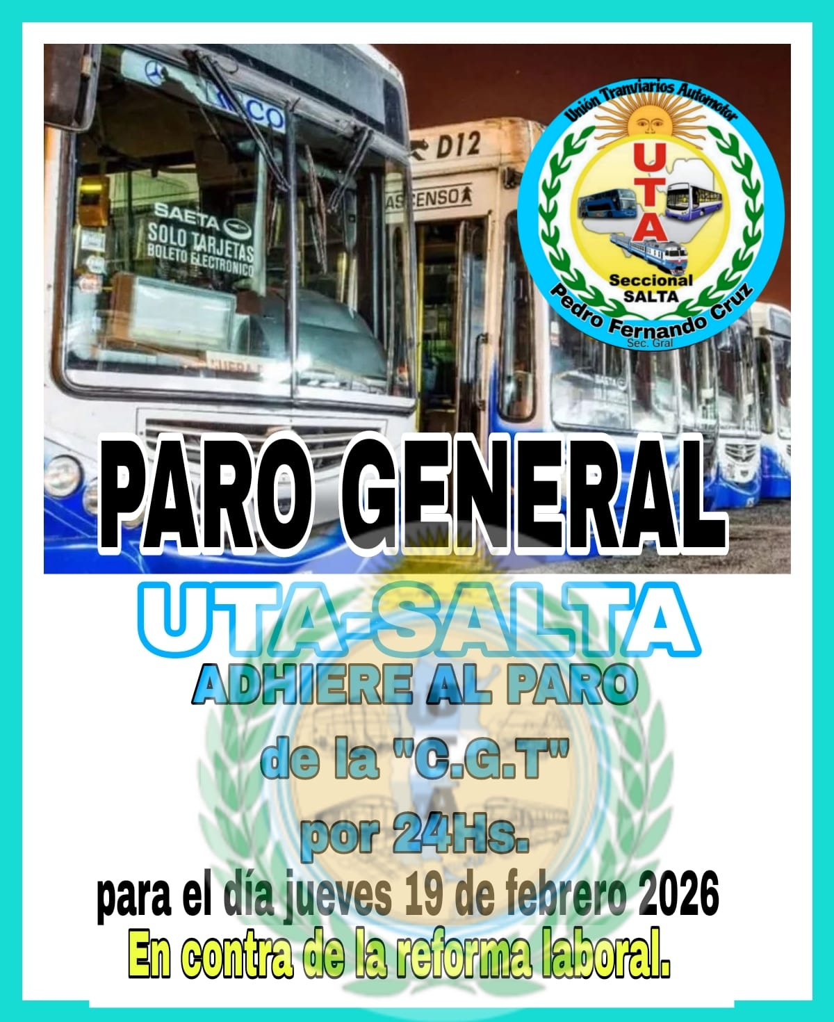 La Unión Tranviarios Automotor (UTA) Seccional Salta confirmó su adhesión al paro general convocado por la CGT para el jueves 19 de febrero de 2026, en el marco de una jornada nacional de protesta en contra de la reforma laboral.