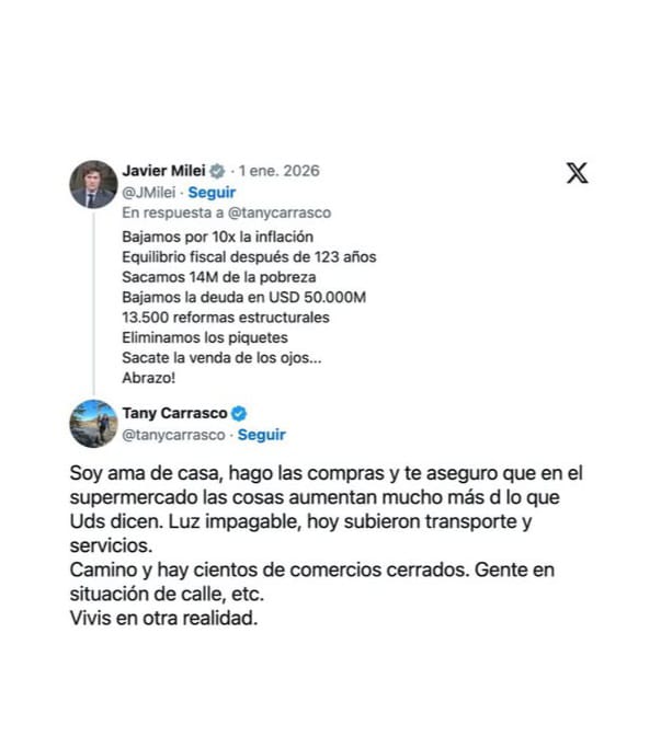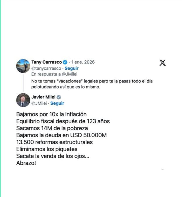 Asombrosamente, al parecer el comentario algo le movió a Milei que se tomó el tiempo para responderle con sus “logros de gestión”. El mismo enumeró los siguientes: “bajar la inflación, lograr el equilibrio fiscal, sacar a 14 millones de personas de la pobreza, bajar la deuda, reformas y eliminar los piquetes”.